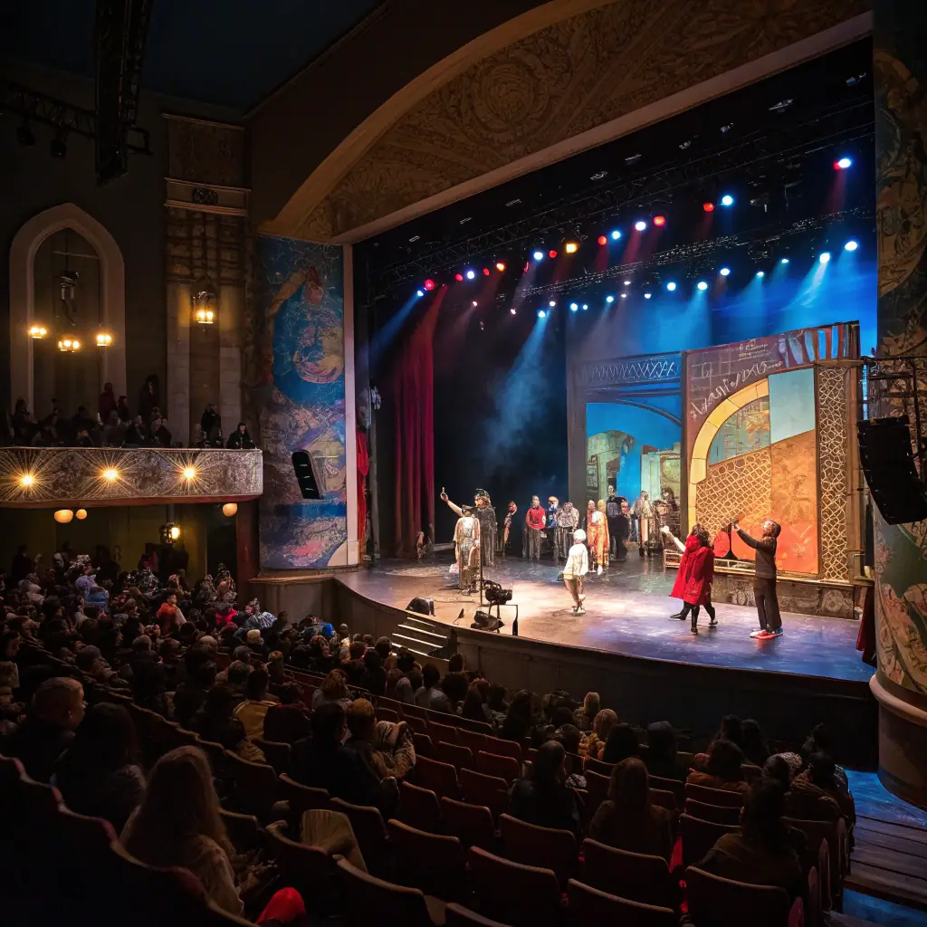 A vibrant photograph capturing a scene from a recent theatrical performance at SCÈNE NATIONALE DE L'ESSONNE AGORA-DESNOS, showcasing actors in costume on stage with dynamic lighting.